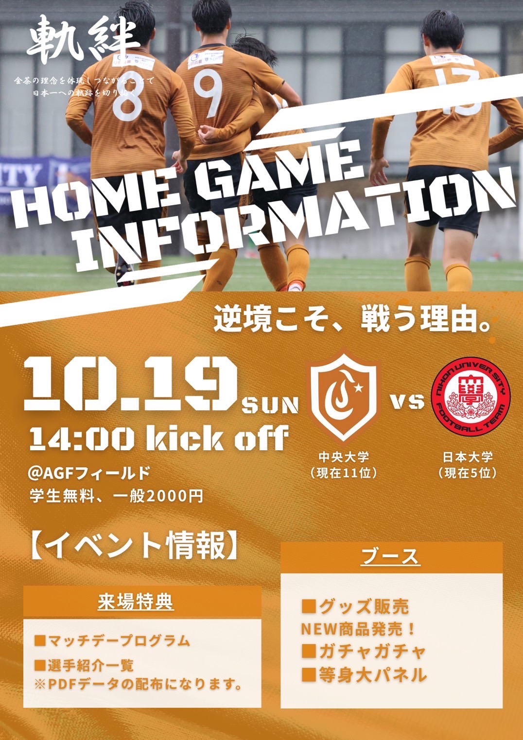 10/19(日)に行われます、関東大学サッカーリーグ戦1部 第17節 中央大学 対 日本大学(@AGFフィールド)のイベント情報を公開いたします!