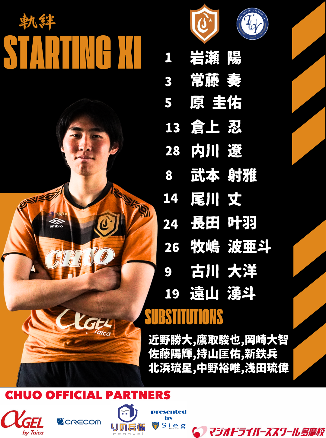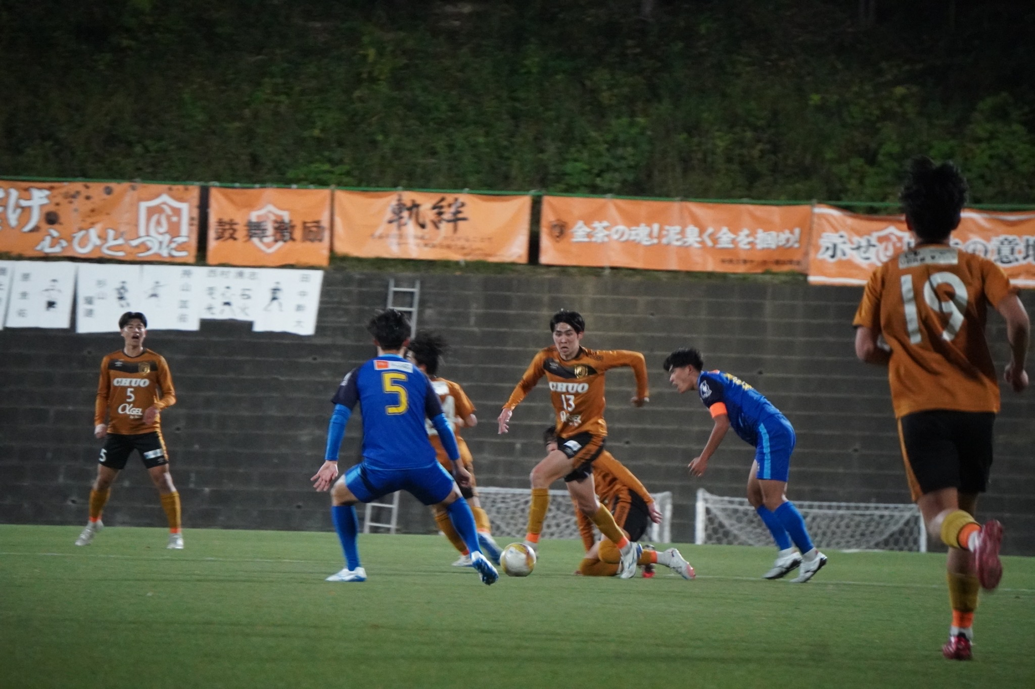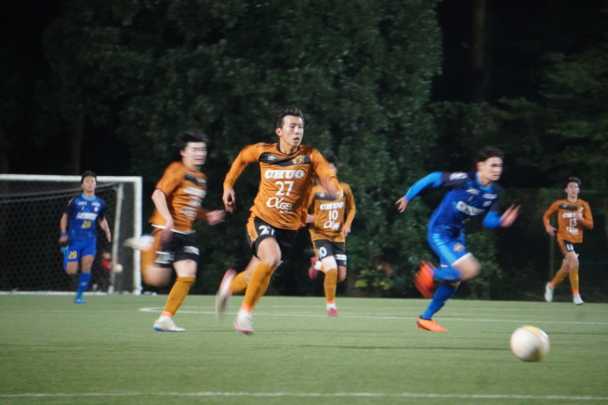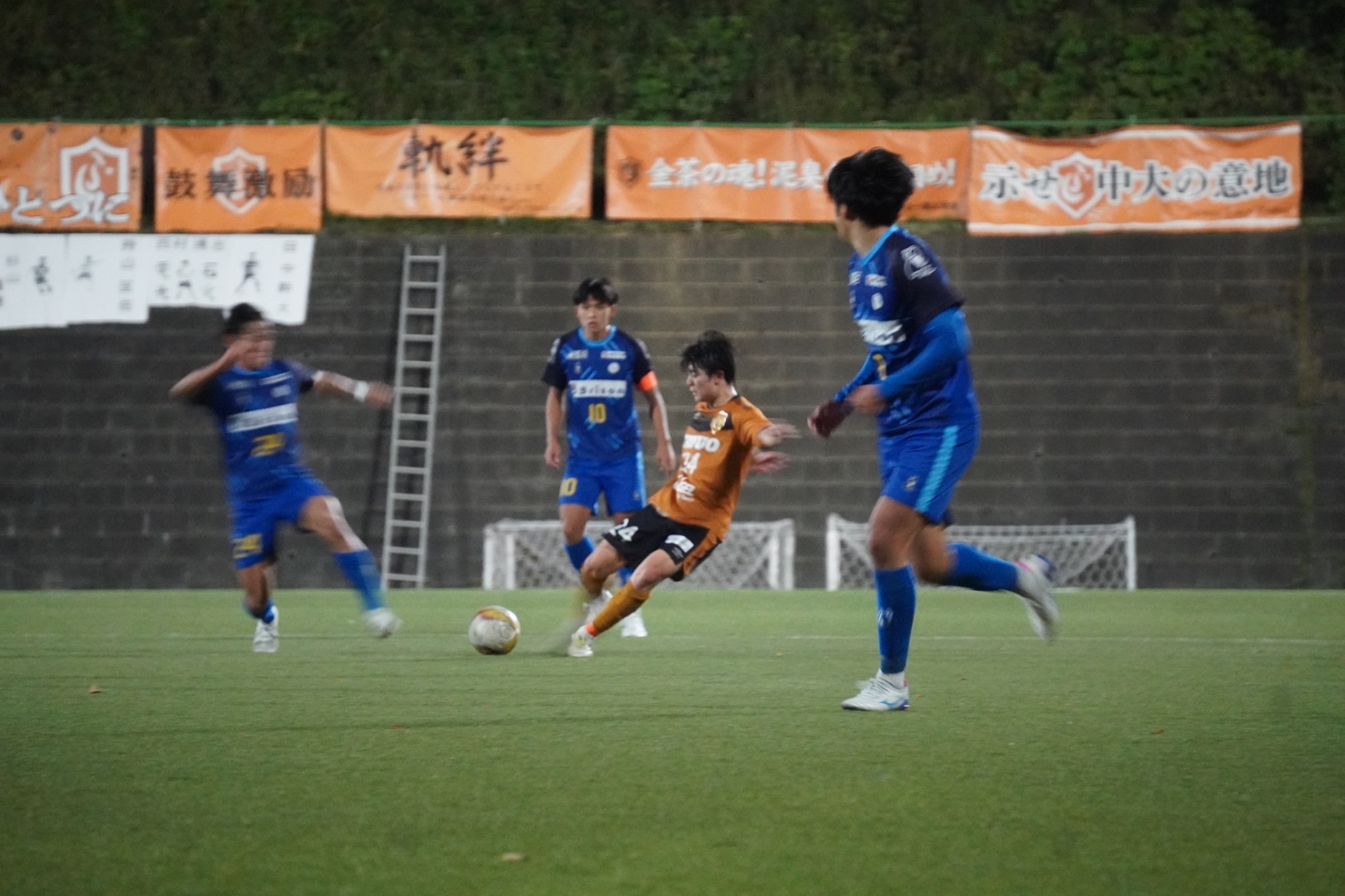 〇戦評<試合開始>前半26分:牧嶋のアーリークロスのこぼれを長田がシュートを放つも、ゴール右に外れる前半31分:牧嶋のクロスに武本が飛び込むが、相手のクロスに阻まれる 前半41分:選手交代 古川out,浅田in <前半終了>中央大学 0-0 桐蔭横浜大学<後半開始>後半1分:右サイドを突破されシュートを放たれるも、岩瀬の連続セーブでピンチを凌ぐ後半5分:失点 PKで失点 後半7分:選手交代 武本,遠山out持山,北浜in 後半14分:選手交代 牧嶋out,北浜in 後半18分:コーナーキックのこぼれ球からミドルシュートを放たれるも、岩瀬のビックセーブでピンチを凌ぐ 後半39分:常藤のクロスから北浜が飛び込むも、ゴール右に外れる 後半42分:得点 右サイド抜け出した中野が冷静に流し込んで同点 後半47分:失点 左サイドから切り込んでシュートを放たれ失点 <試合終了>中央大学 1-2 桐蔭横浜大学〇監督・選手振り返り宮沢正史「今年の中大グラウンドでの最終戦は、残留するために内容よりも結果を求めて、桐蔭横浜大学に挑みました。前半我慢強く対応しながら良い守備から良い攻撃に繋げていましたが、後半の入りが緩く先に失点し追いかける展開になりました。システム変更しながら徐々に押し返しチャンスを作り同点にして、もう1点取りたかったところですが、逆に失点してしまい悔しい敗戦になりました。課題修正ポイントはありますが、もう気持ちを切り替えて次の東京国際大学との試合に向かっていきたいと思います。この試合も大事な6ポイントゲームになります。必ず勝利を掴み取ります。」 持山匡佑「残留するために勝ちが必要な試合でしたが、後半の最後に失点し、勝つことができませんでした。中2日で東京国際戦があるので、切り替えて準備していきたいです。応援よろしくお願いします!」〇マッチフォト |
