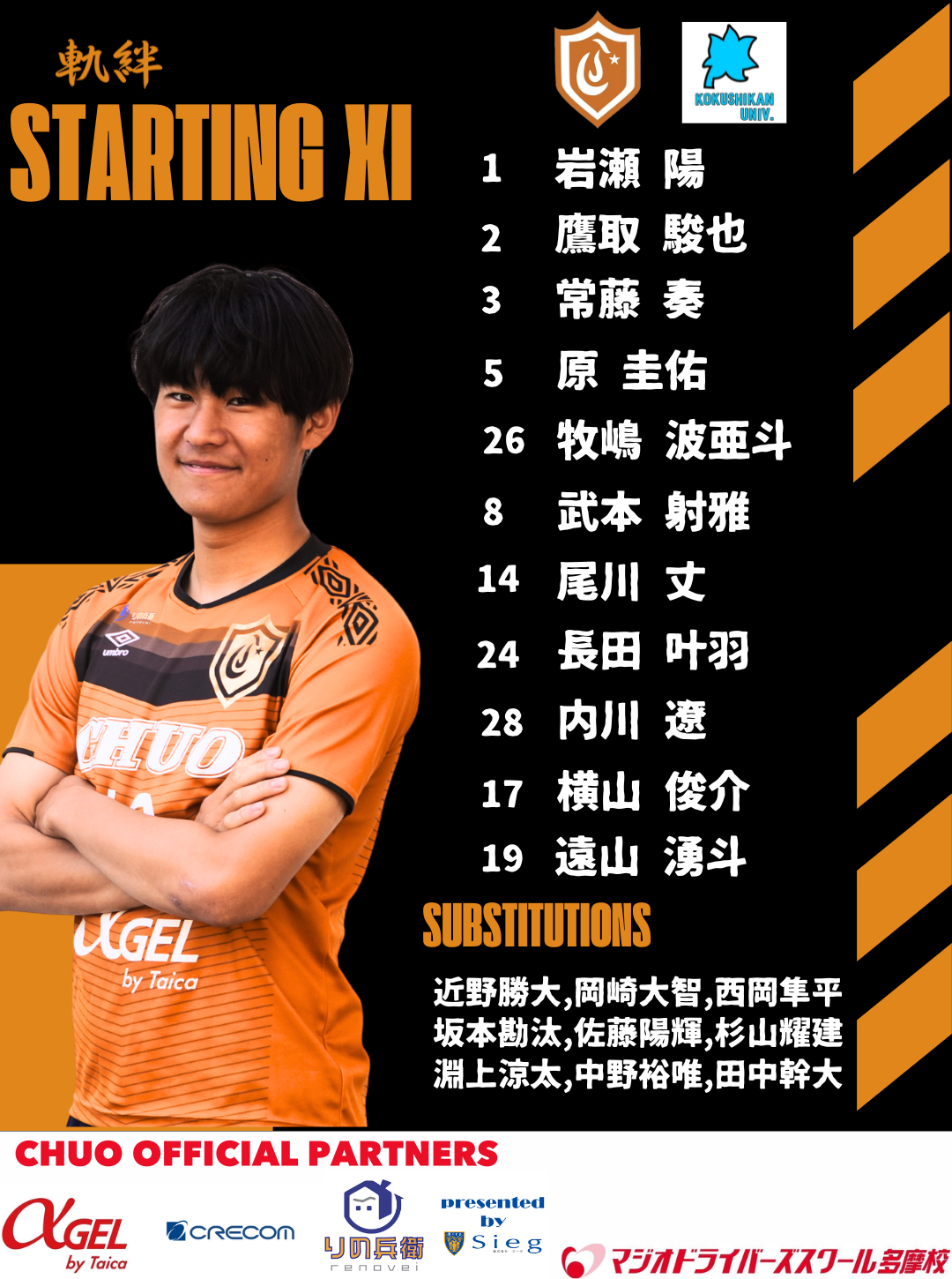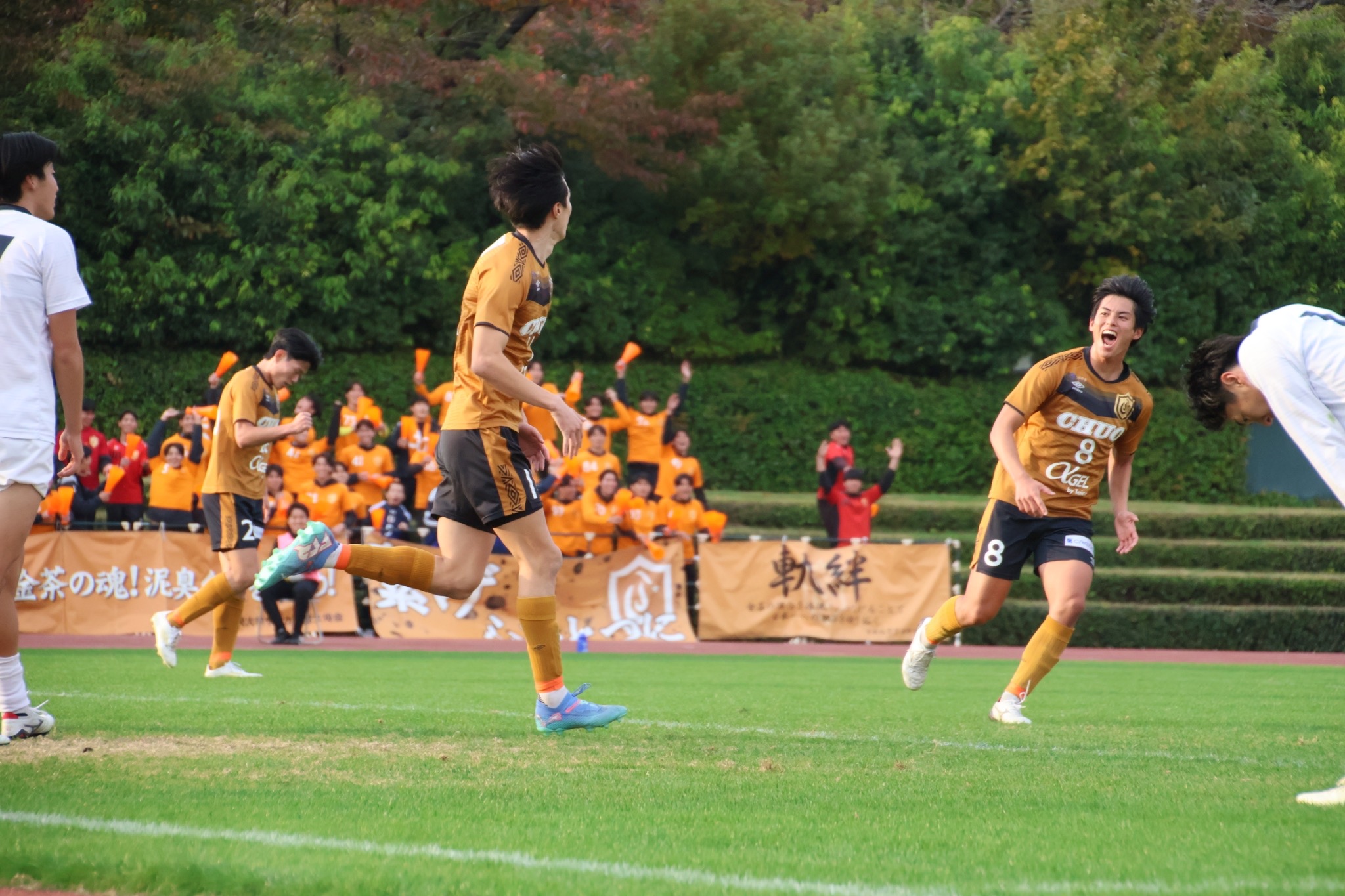 〇戦評<試合開始>前半5分:遠山が前線からの守備でボールを奪いシュートを放つも、相手GKの好セーブに会う前半23分:失点 左サイドのクロスを正面で合わせられ失点 前半29分:左サイドを崩して遠山がシュートを放つも、ゴール上に外れる 前半36分:内川のクロスに遠山が飛び込むも、オフサイドで得点取り消し 前半38分:選手交代 横山out,淵上in <前半終了>中央大学 0-1 国士舘大学<後半開始>後半13分:選手交代 遠山out,田中in後半19分:得点 左サイド鷹取のクロスから田中が飛び込んで同点 後半22分:CKから常藤が合わせるもゴール左に外れる 後半37分:選手交代 牧嶋out,中野in 後半39分:得点 ゴール中央を抜け出した尾川のシュートのこぼれ球を武本が押し込んで逆転 <試合終了>中央大学 2-1 国士舘大学〇監督・選手振り返り宮沢正史「1部残留するためにも、中大の意地とこれまでやってきた全てを出し切り、2位の国士舘大学から勝利を掴もうと全身全霊の想いで挑みました。前半に隙をつかれて先制されましたが、最後まで諦めず2得点奪い逆転勝利し、価値ある貴重な勝ち点3を掴み取ることが出来ました。 今日の熱い応援も素晴らしく、4年生最後の意地で熱いプレーを体現し、一体感と結果を残してくれました。 ただまだ何も決まっていません。夏の総理大臣杯で悔しい想いをした東洋大学相手に勝利を掴み取り、残留を勝ち取りたいと思います。 今年最後の1週間を最高の練習をして挑みたいと思います。最後まで熱いご声援をよろしくお願いします!」 武本射雅「残留するために勝利が絶対必要な試合でした。先制されましたが、後半はよりアグレッシブに戦い逆転勝利し2連勝する事が出来ました。 まだ残留が決まったわけではないので、最終節の東洋戦絶対勝ちます。応援ありがとうございました。」 〇マッチフォト |