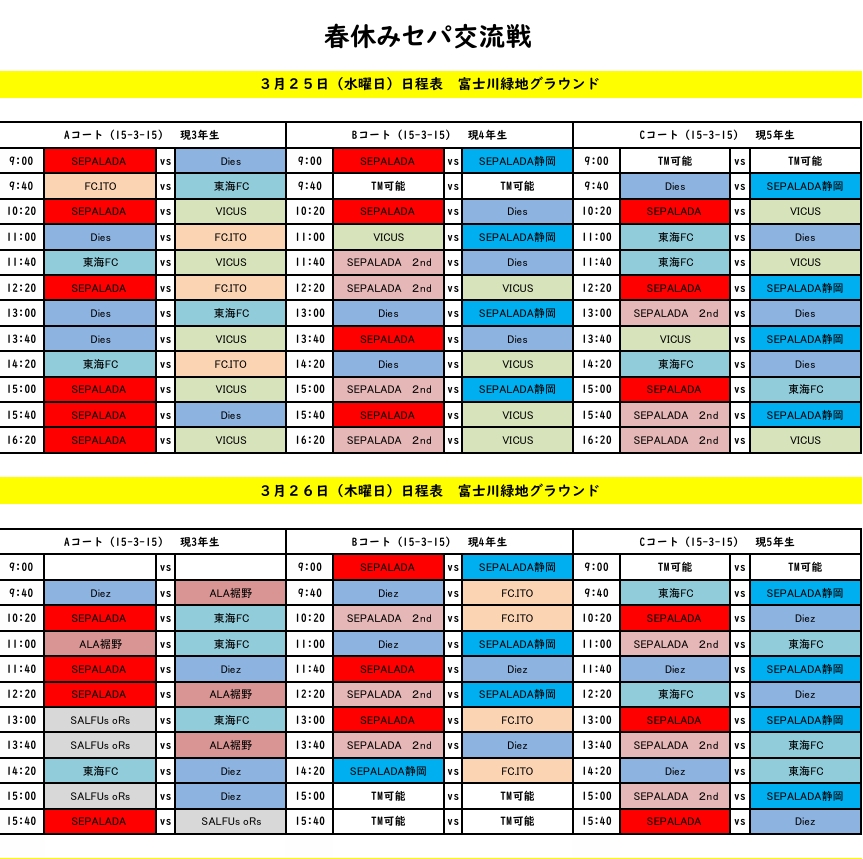 【対 戦】熱海FC 【学 年】全学年 【会 場】小室山公園グラウンド 【時 間】現地08時00分集合(6年生.5年生) 【時 間】現地08時30分集合(4年生.3年生) 【時 間】現地09時00分集合(2年生.1年生) 【その他】 ・午前開催 ・ビブス着用です。 TRMスケジュール |