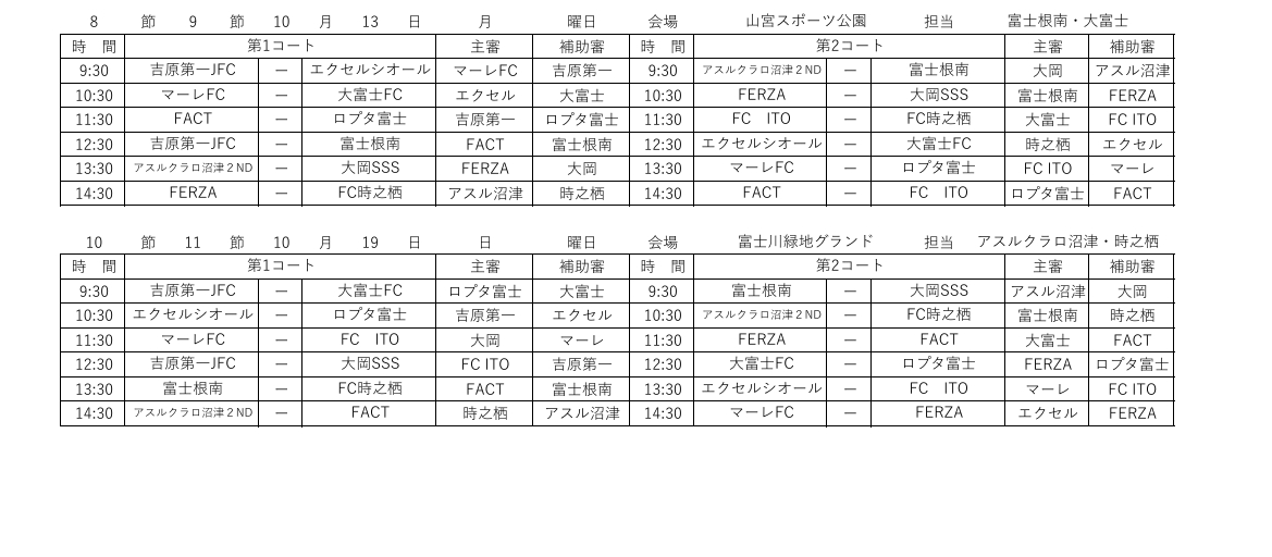 【対 戦】ロプタ富士 【学 年】U12(6年.5年) 【会 場】山宮ふじざくら球技場 【時 間】現地8時30分集合 【その他】 ・1日開催のため弁当ありです。 ・ユニフォーム着用です。 大会スケジュール |