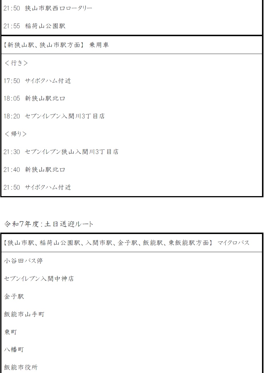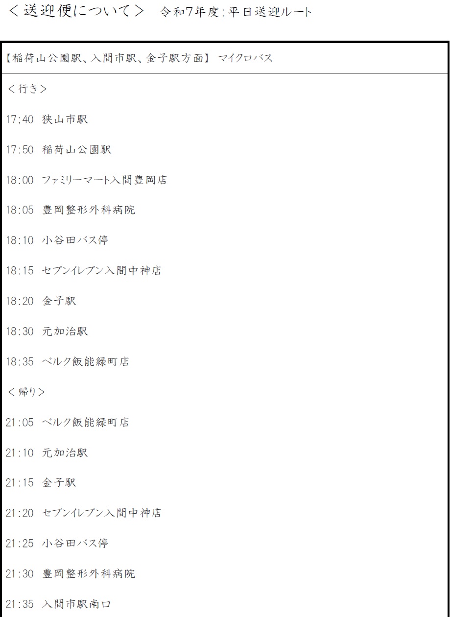 当チーム所有のマイクロバスにて平日のジャクパ狭山グランド、狭山市民総合体育館を中心に送迎を実施しております。週末に関しては可能な限り、送迎を実施しております。