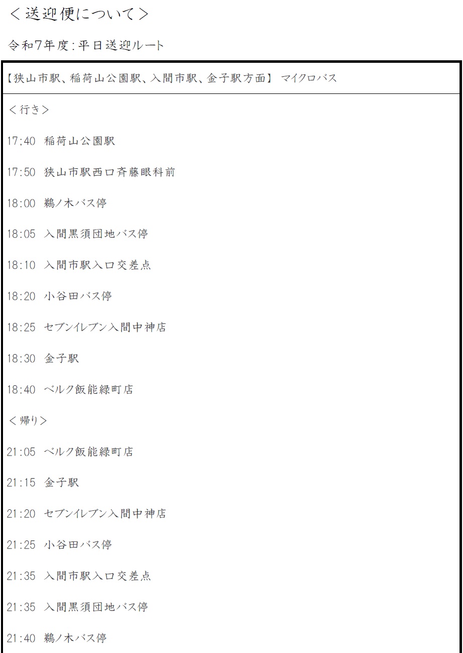 休日の送迎については、活動時間に応じて、送迎担当者からお知らせします。