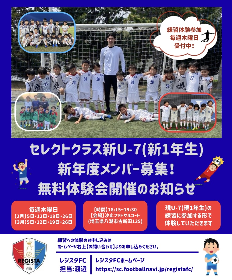 レジスタFC では新U-7(新小学1年生)対象に新メンバーの募集を目的とした無料体験会を開催いたします。