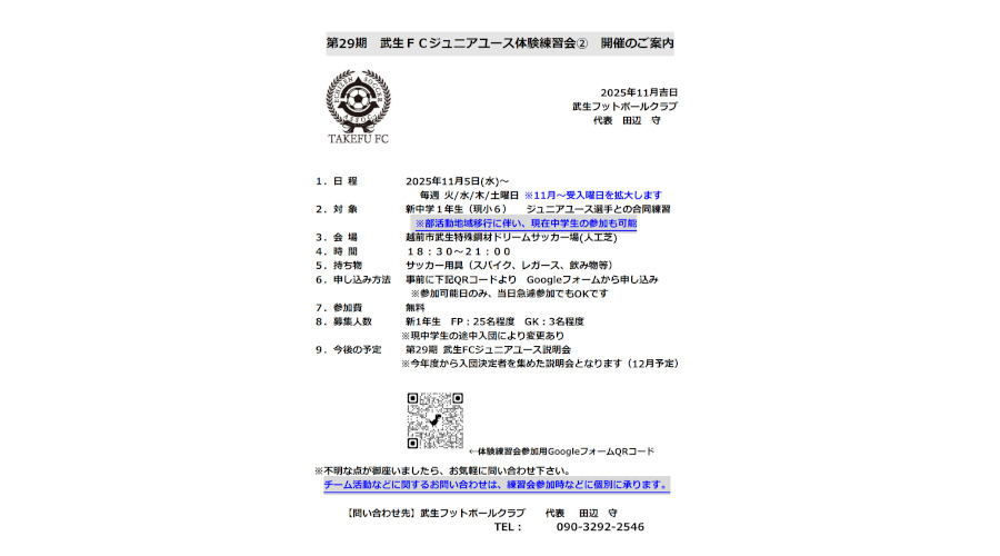 【開催中】武生FCジュニアユース練習会のご案内