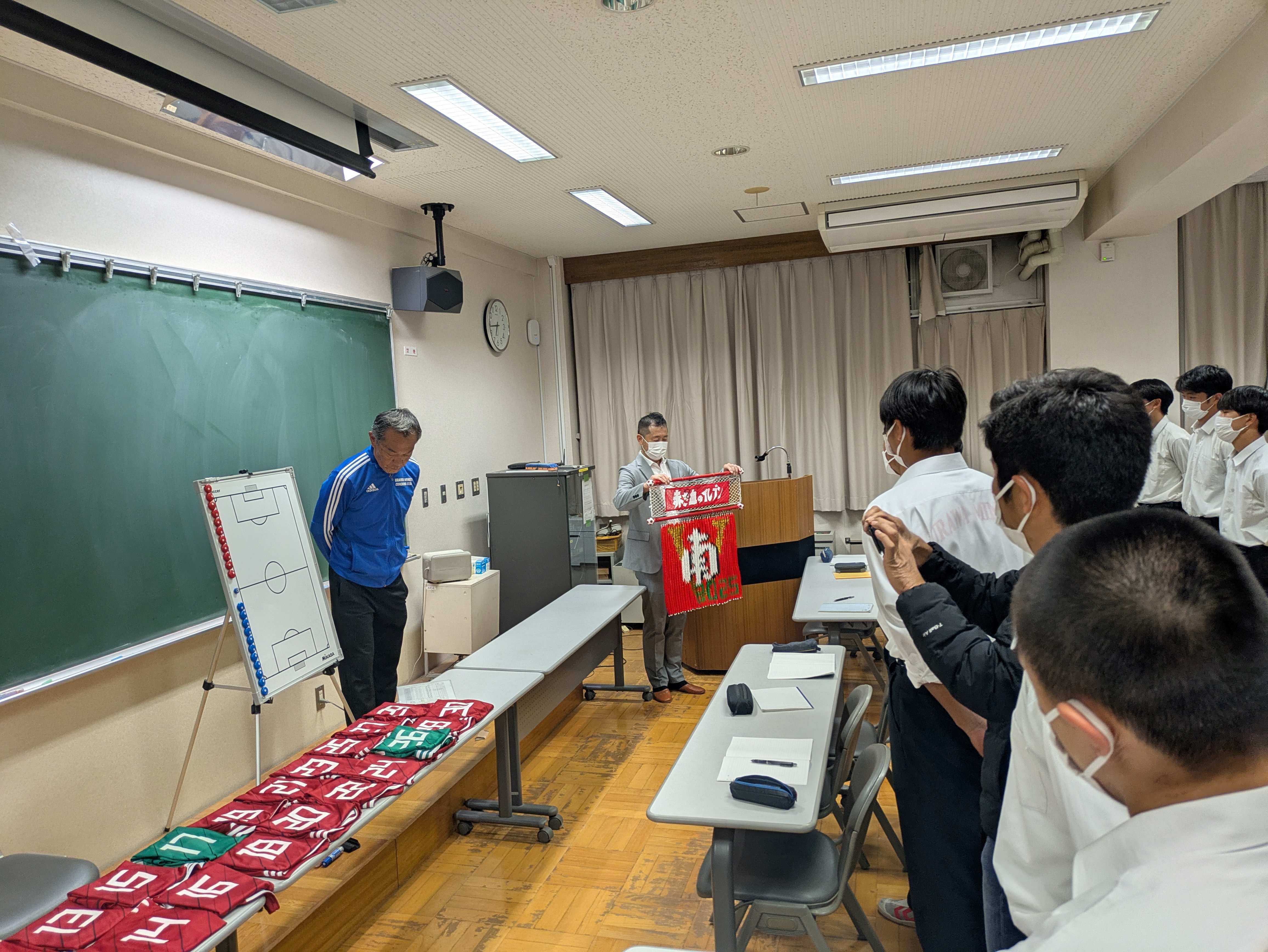 第104回全国高校サッカー選手権埼玉県大会、浦和南高校は初戦の2回戦が10/19(日)に行われる。10/17(金)に恒例のユニフォーム渡しを行った。監督から選手名を呼ばれると、選手は力強いコメントでユニフォームを手にした。約1か月に及ぶ戦いが開幕する。父母会より勝ち鶴をいただきました。また、OB会からも激励の言葉をいただきました。